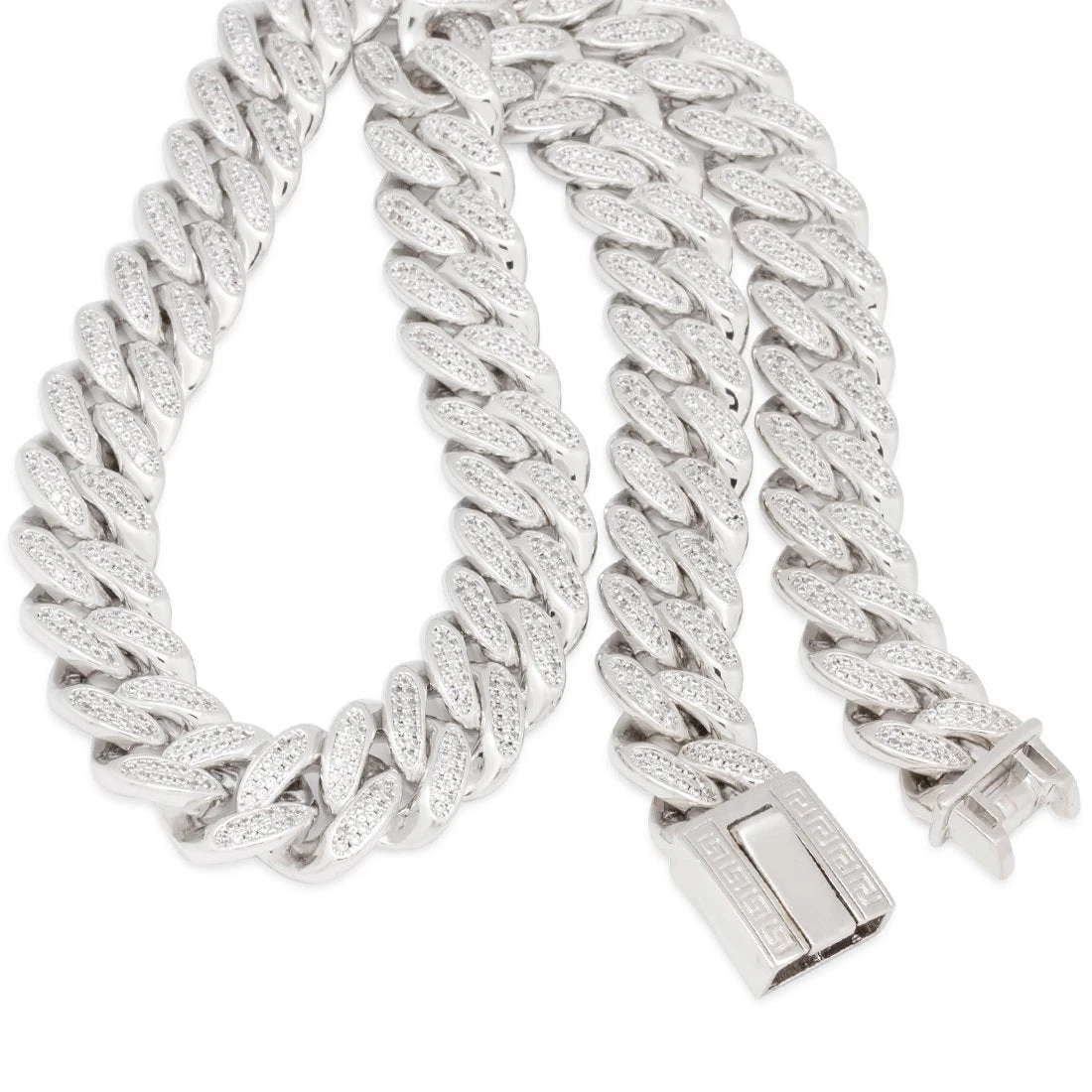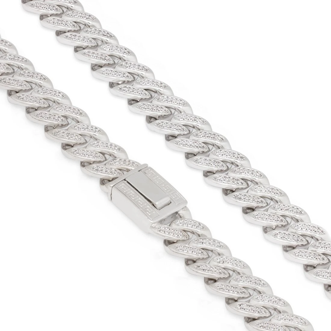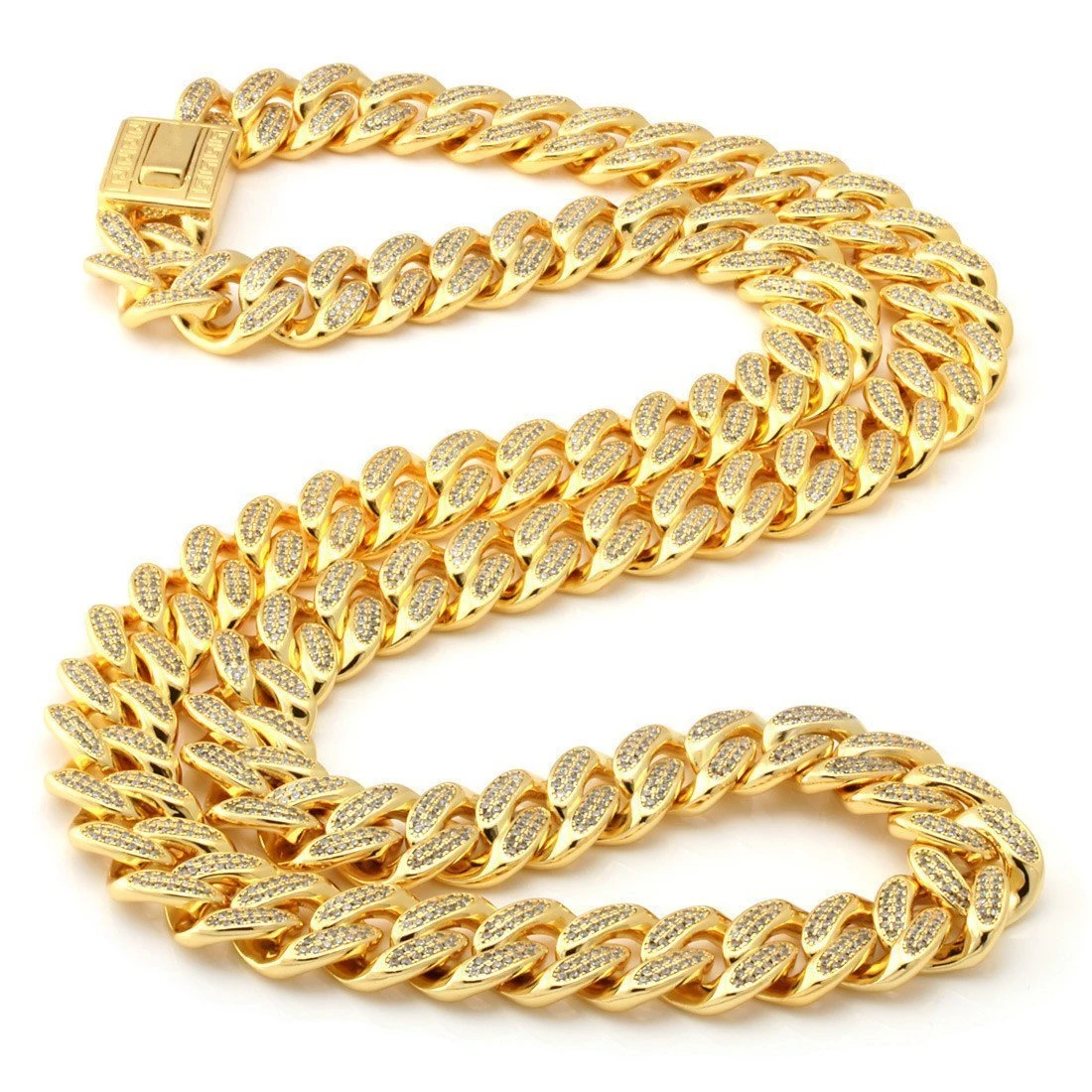 As one of the most recognizable hip hop chain types, the Miami Cuban Link remains a favorite among recording artists and hip hop fans. Now, you can own this “Flooded” version that features clear CZ stones lined along each curb link to offer a vibrant look to match your lifestyle. With 14K Gold plating, each chain provides an elegant shine to coordinate with 15mm thick links that provide a large, heavy feel for gentlemen after a more eye-catching design. Each chain also includes a clasp that provides a hidden, quick release mechanism that includes an elegant Greek Key design alongside the King Ice name.