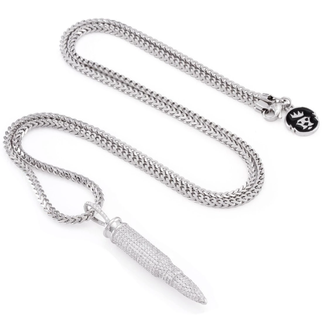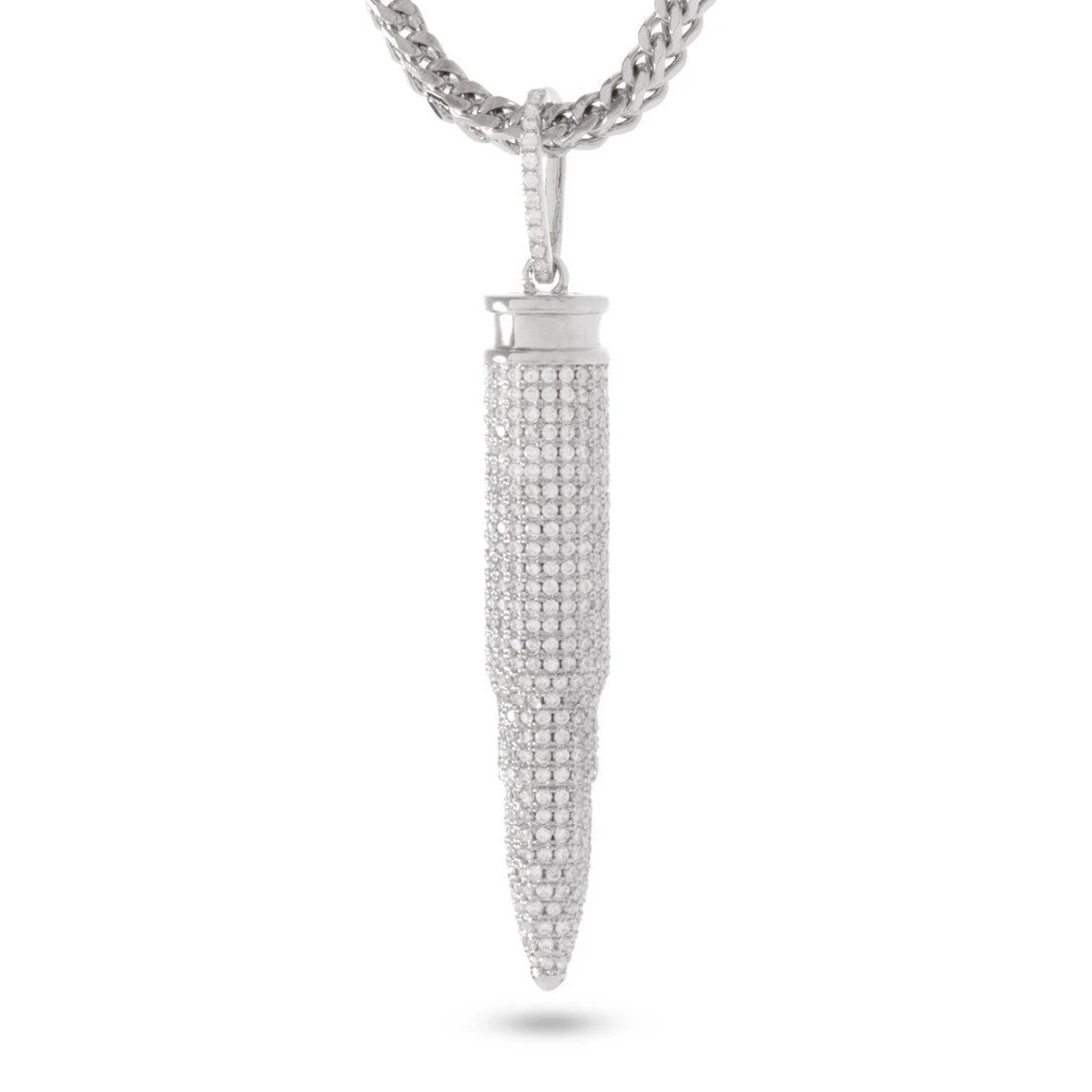 Our .223 caliber bullet necklace is designed after M16 and AR-15 standard ammo. Each piece is iced with handset VVS Diamond Simulate stones and available plated in 14K Gold or White Gold. This piece is paired with a 20″ 2.5mm stainless steel franco chain.