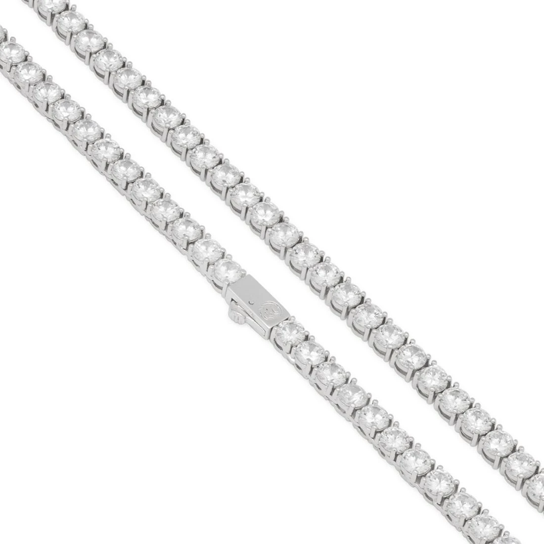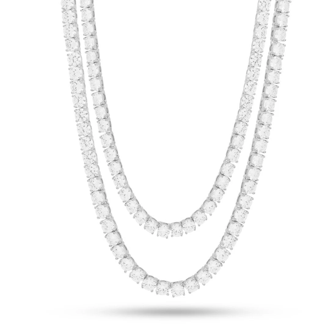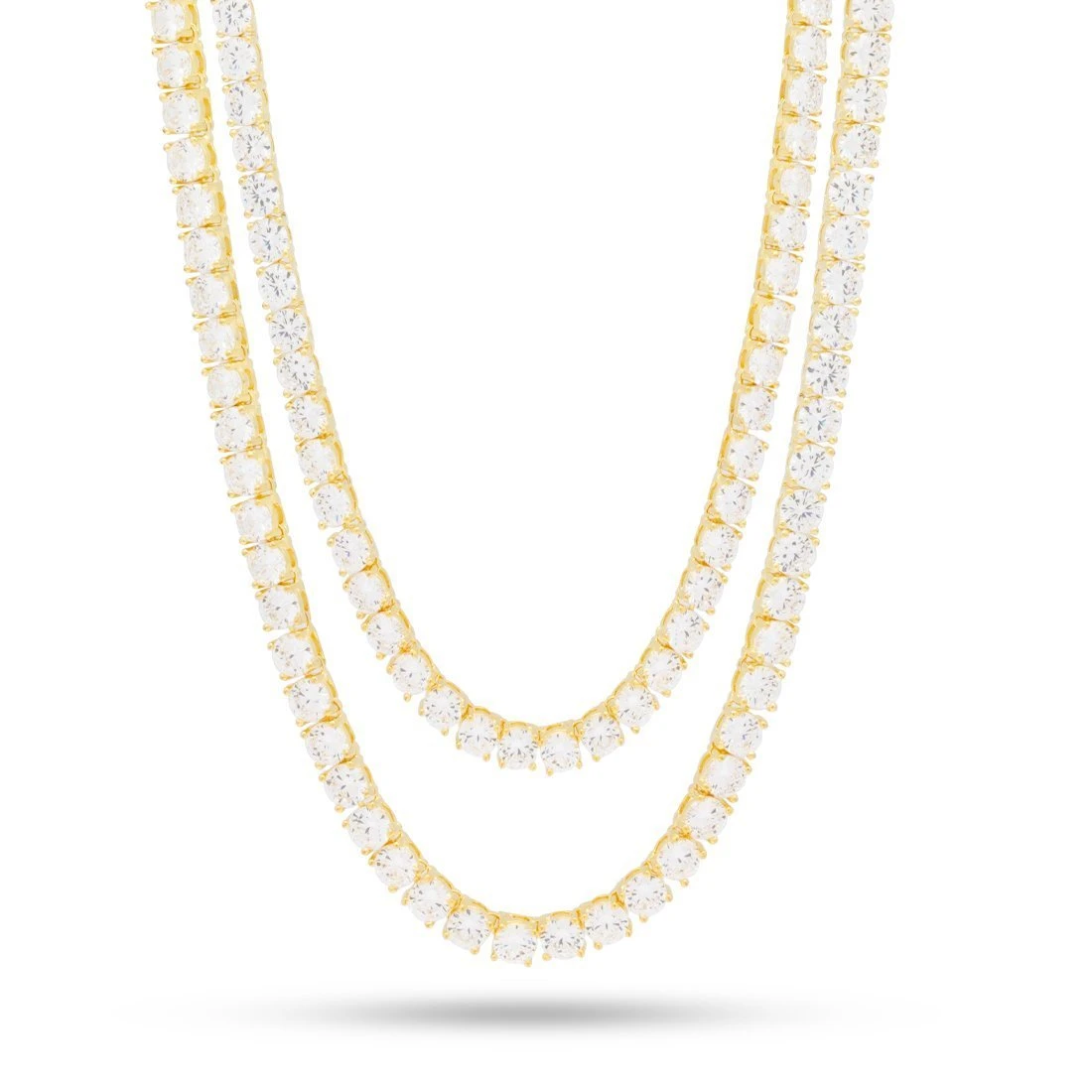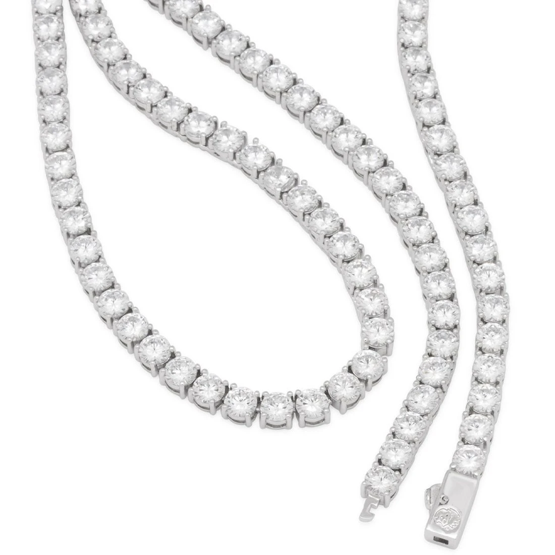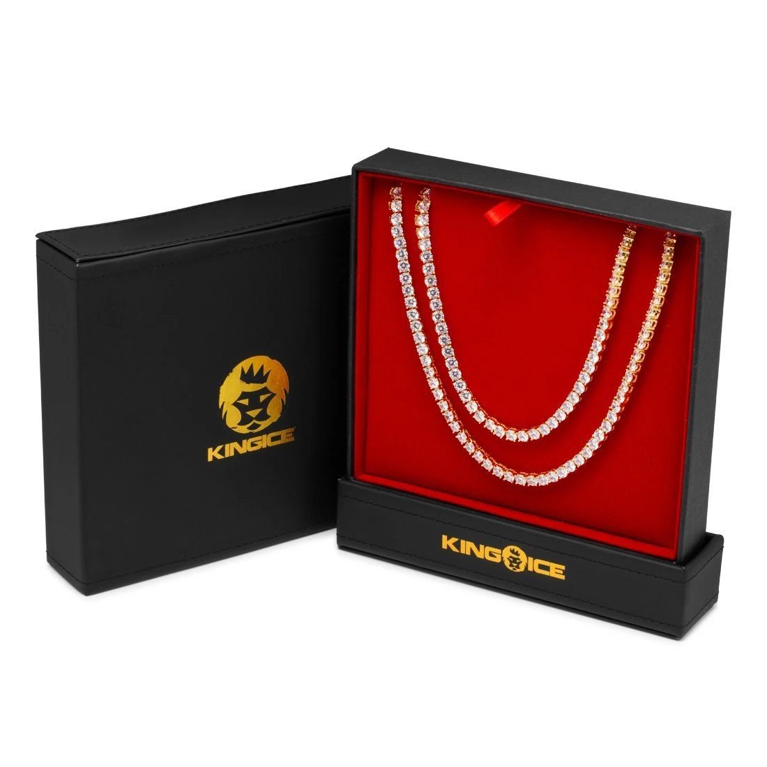 The new King Ice 5mm Tennis Choker Set pays tribute to the multi-use trend rooted by prominent hip hop artists since the late ’70s. Each choker is plated with a 14K Gold or White Gold and features VVS Diamond Simulates. The chokers measure 18″ and 20″ for a suitable match when worn together.
