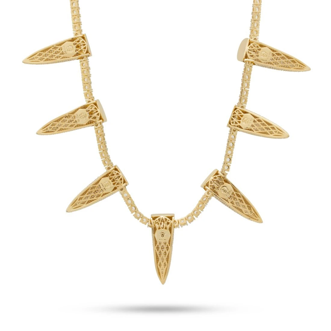 Inspired by a popular superhero, the Wakanda Necklace is recreated in 14k gold plating and is completely covered in Grade AAA lab diamonds for a vibrant shine and presentation. Each necklace is 20″ in length that includes a box clasp for a secure fit.