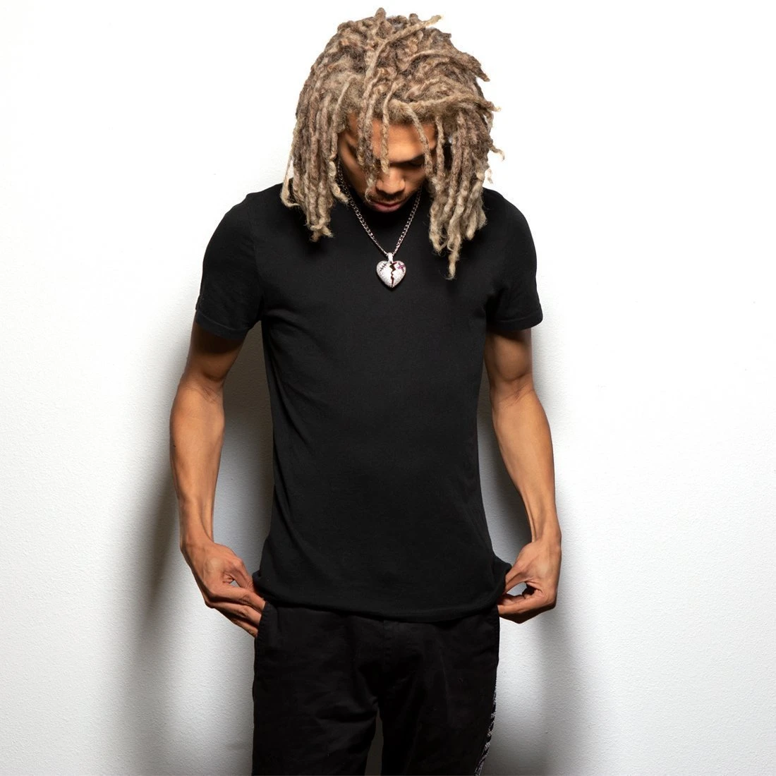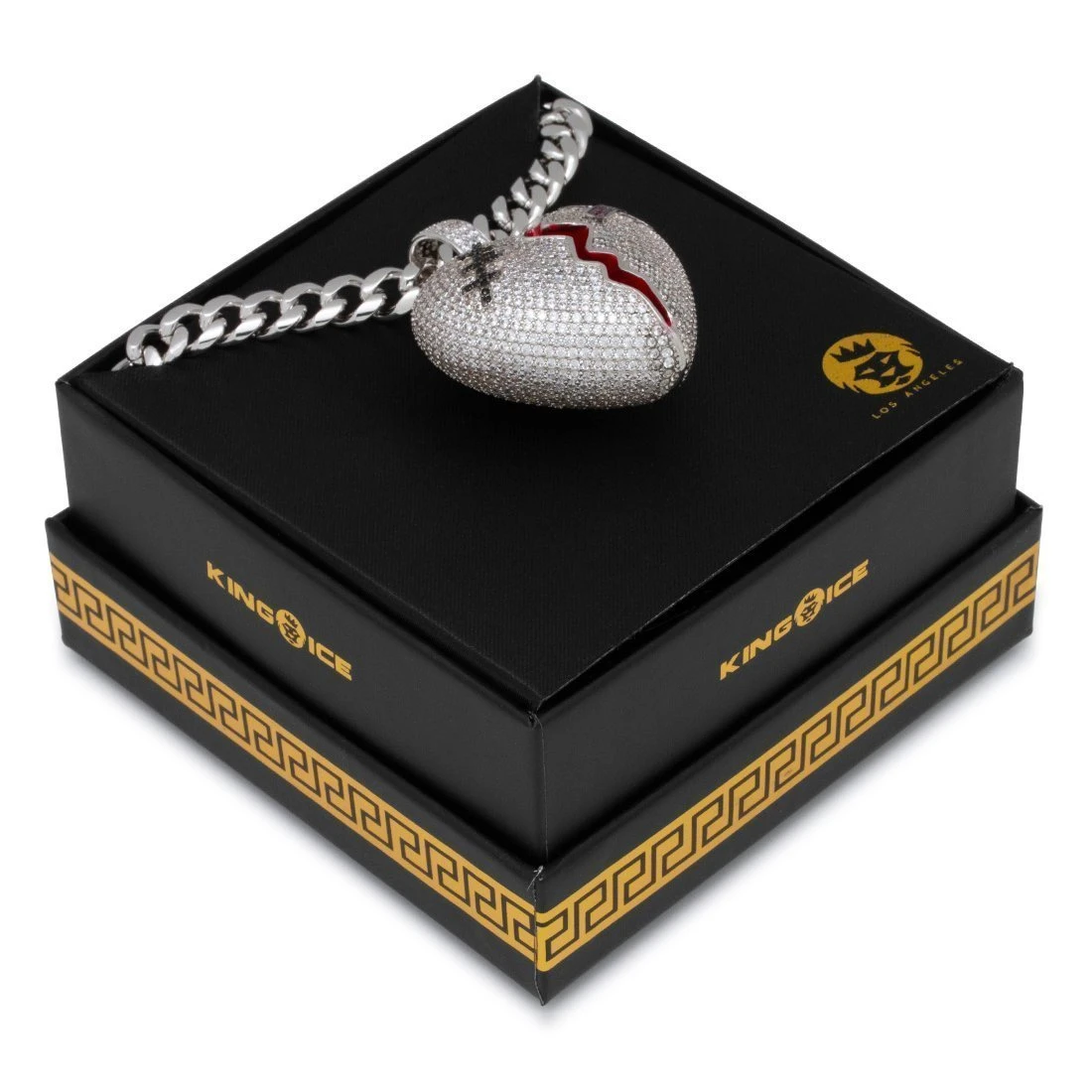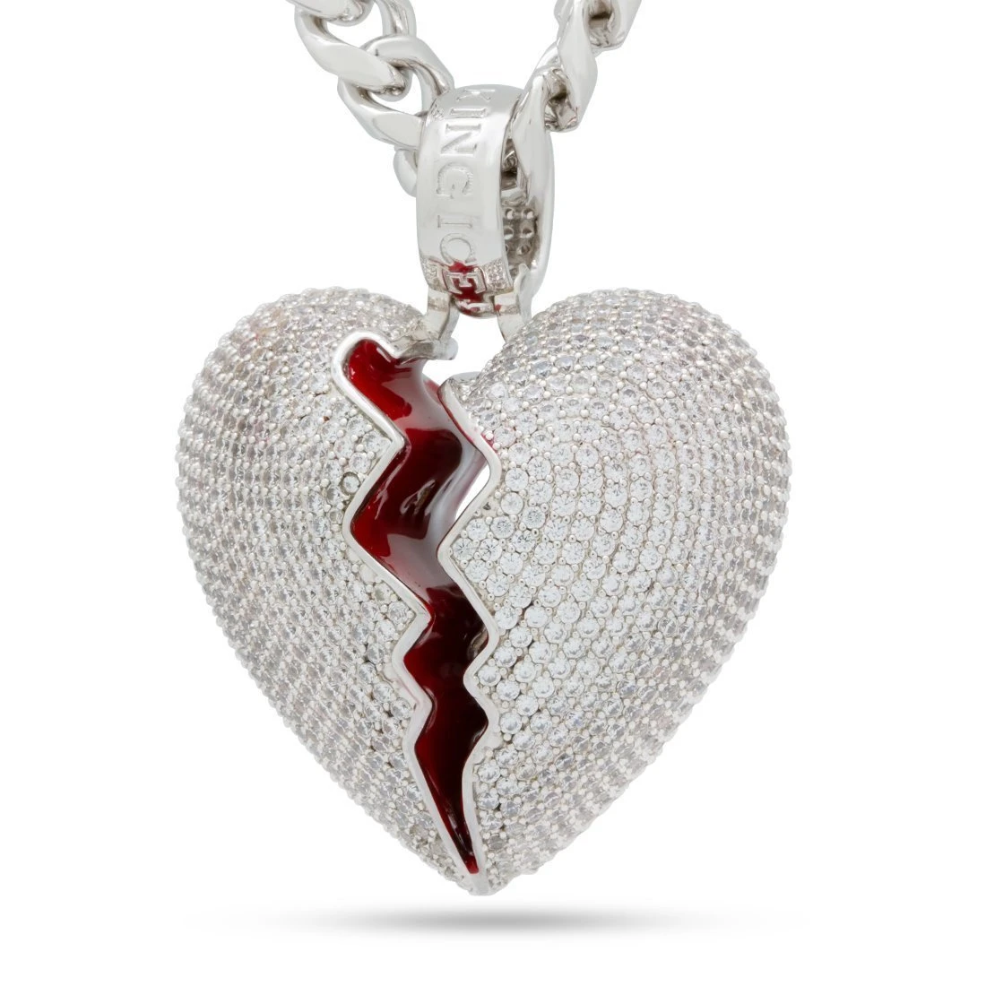 Having a broken heart isn’t fun or daring, but the iced Broken Heart Gold Necklace is. Each heart is split with a zigzag motion and red on the inside as if there’s anything left to spill out. A magenta VVS Diamond Simulate band-aid and an onyx VVS Diamond Simulate stitch band-aid decorate the broken heart. 14K Gold plating gives the broken heart necklace a flossy, finished look. Each necklace is accompanied by a 20″, 8mm Miami Cuban Chain.