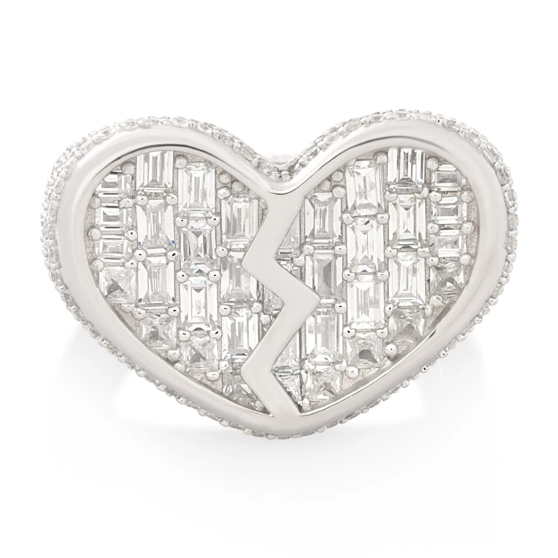 Expertly crafted with quality materials, the Heartbroken Ring showcases intricate detail and sparkling baguette-cut stones inside the heart. Featuring stones on all sides, this stunning piece exudes personality and style. Elevate any look with this luxurious ring.