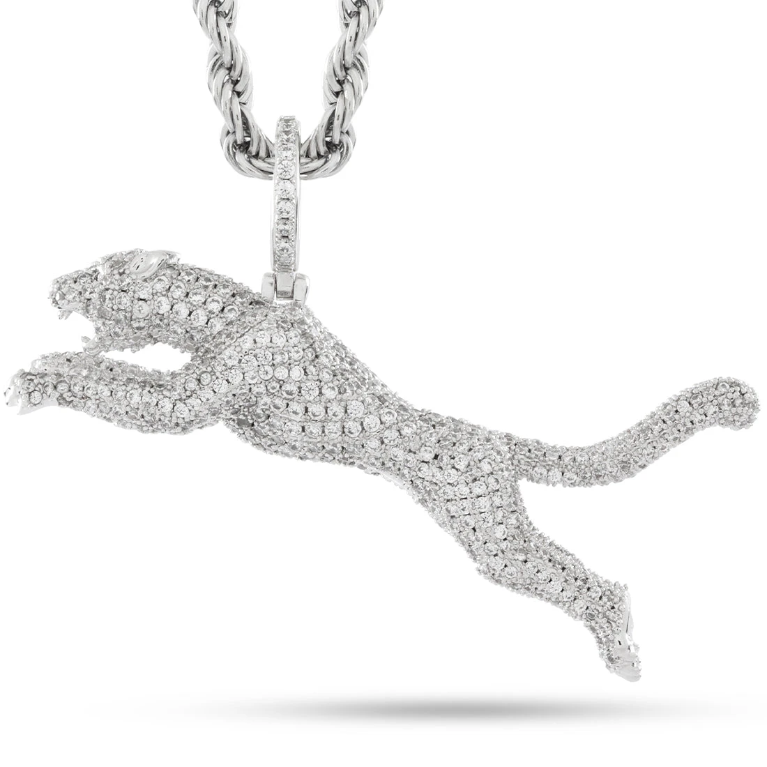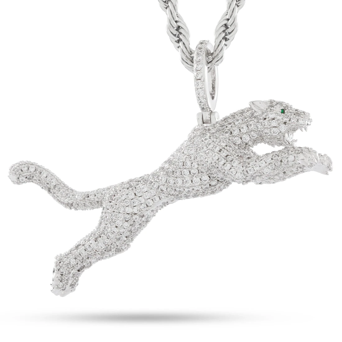 This fully detailed pendant features a 360-degree design with stones on every surface. Green eyes sit above the intricate fangs and claws, giving this Jaguar a fierce look that catches light from all angles.