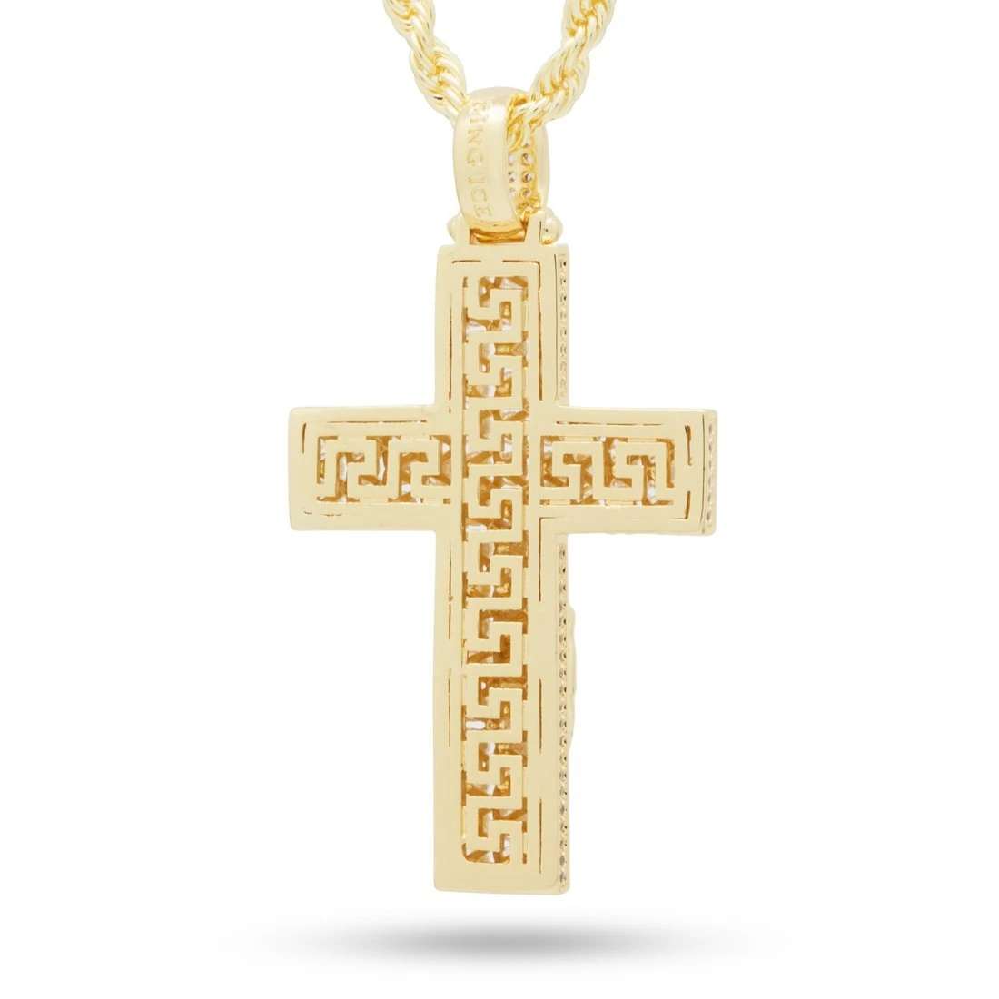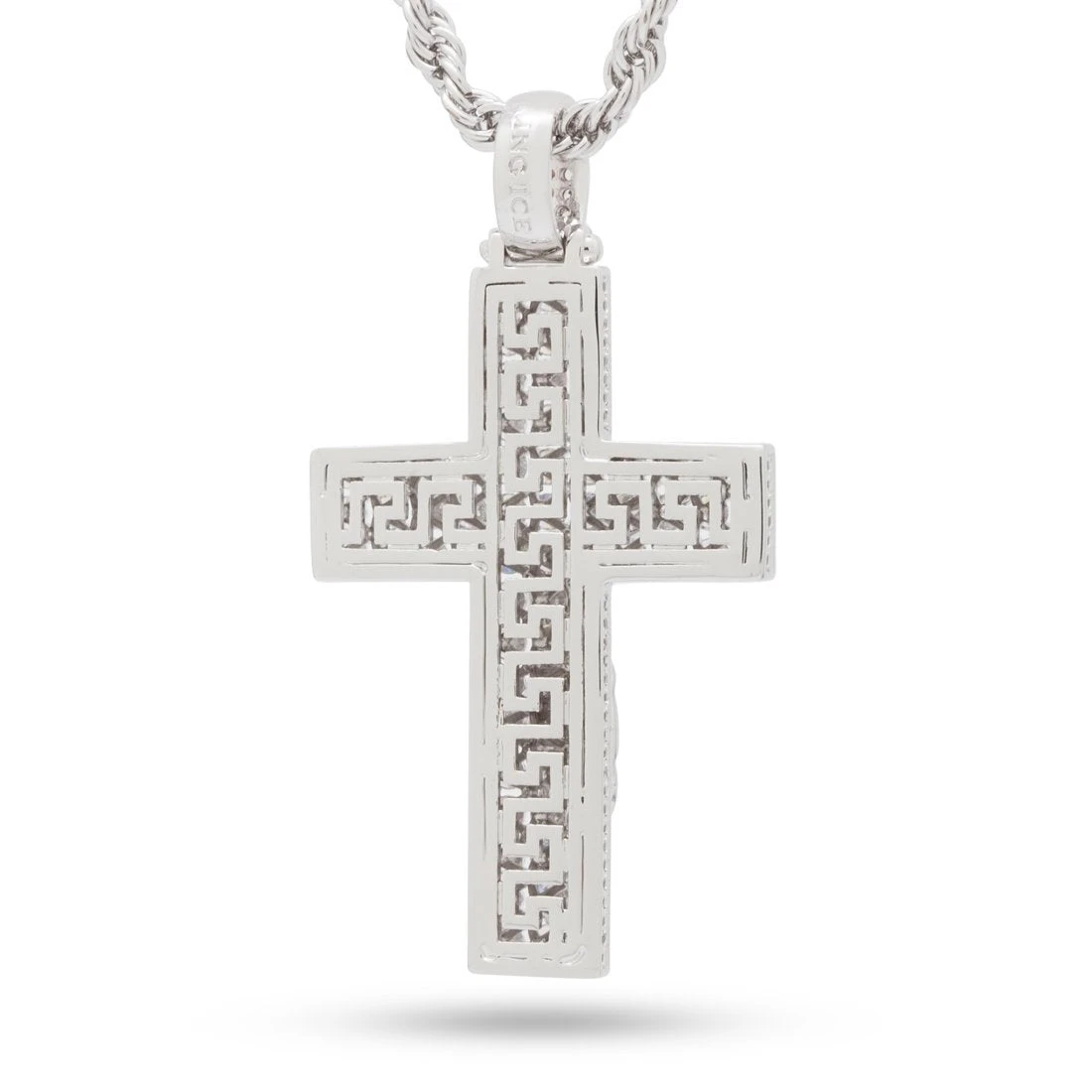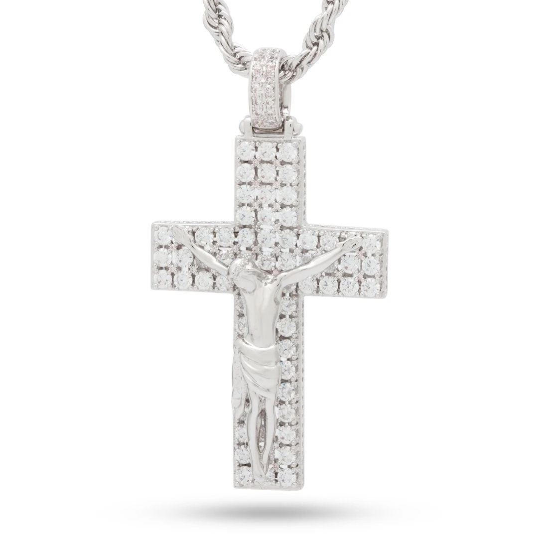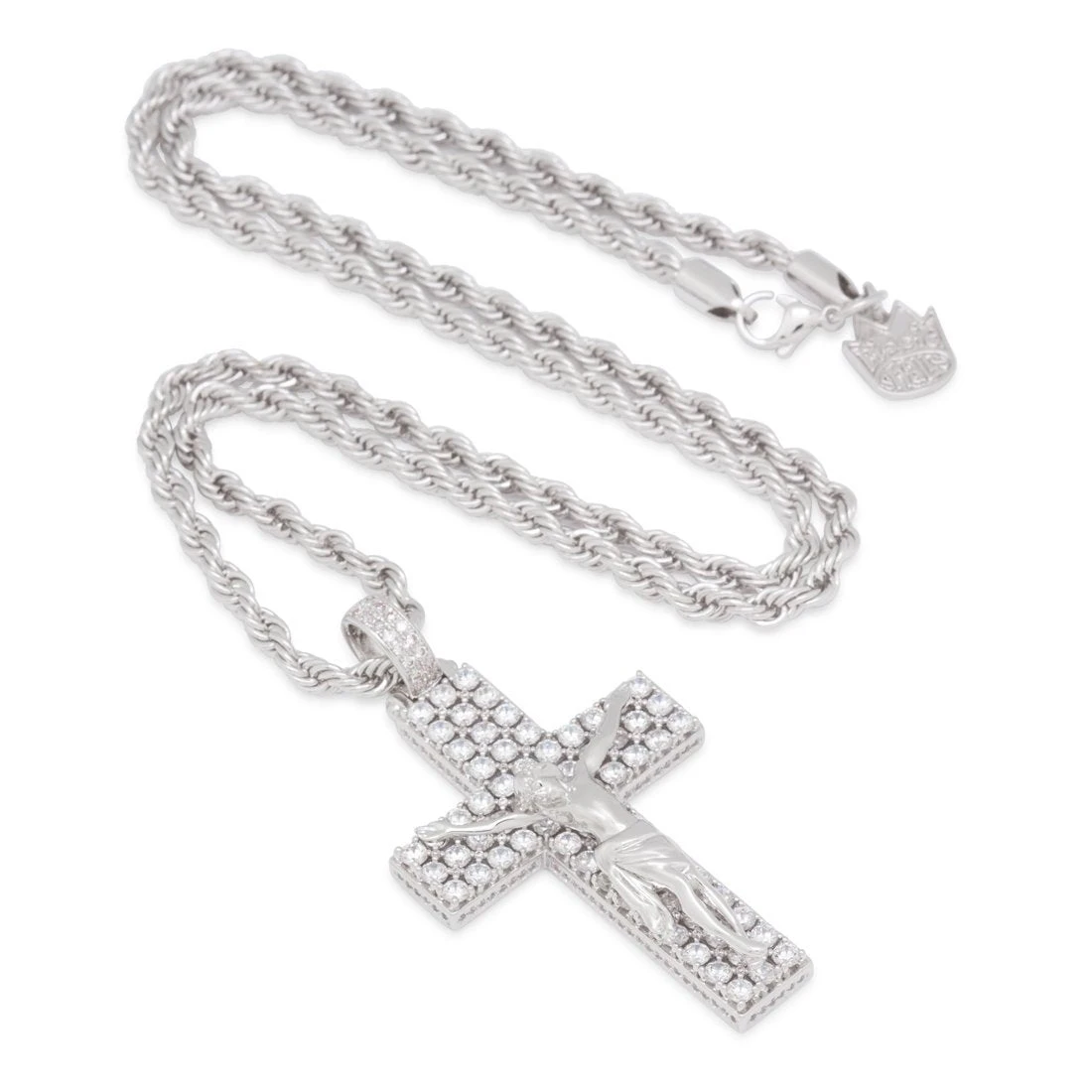 The Biggie Crucifix is bold, just like the Notorious B.I.G. was. A 3D designed Jesus lays on an iced VVS Diamond Simulate cross, while the back of the cross has a sleek Greek Key design. Each crucifix pendant is plated with 14K Gold or white gold plating and comes with a 4mm, 20″ Rope Chain.