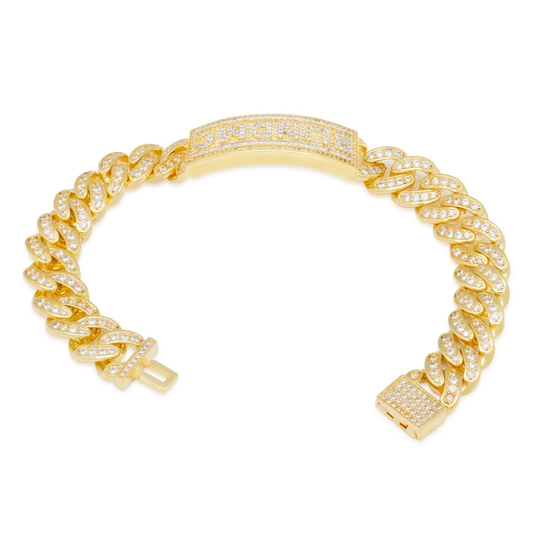 RUN DMC is considered one of the most influential groups in Hip Hop history. The iconic logo, first seen on the My Adidas/Peter Piper single, is clean, powerful, and simple, and inspired by the focused identity of the group. This bracelet features hundreds of handset stones on the clasp, Cuban Links, raised lettering, and the frame.