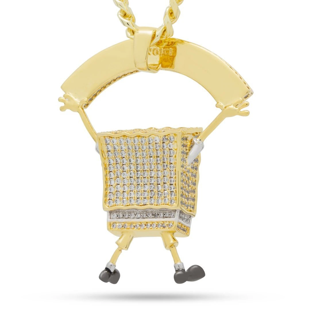 This SpongeBob necklace is 3D designed and iced with round cut CZ stones. Almost 400 clear stones cover his body and clothing, while 162 pink, blue, and yellow stones make up the rainbow. The pendant is dipped five times in 14K Gold plating and finished with white and black gold plating for his shoes and clothing. Each pendant is paired with a 5mm, 20″ Miami Cuban chain.