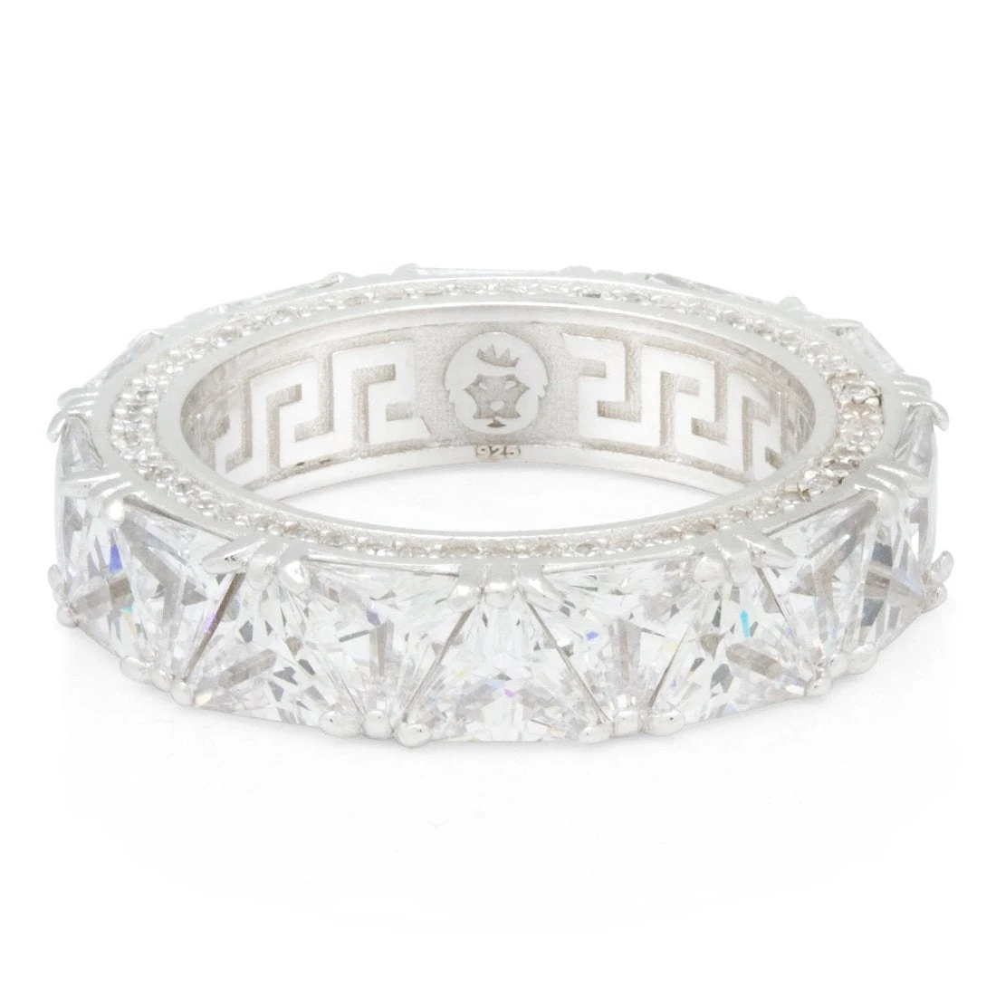 The .925 Sterling SIlver Trinity Stone Ring is iced with more than 100 clear handset VVS Diamond Simulate stones. A thin row of round stones decorates the sides of the ring while a row of large trilliant line the top. Each ring is available in 14K gold plating and white gold plating.