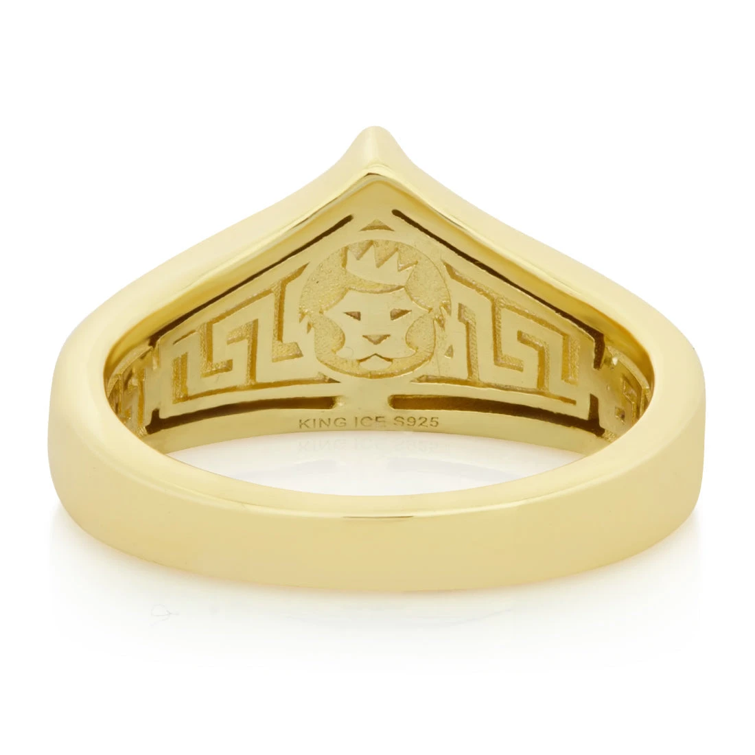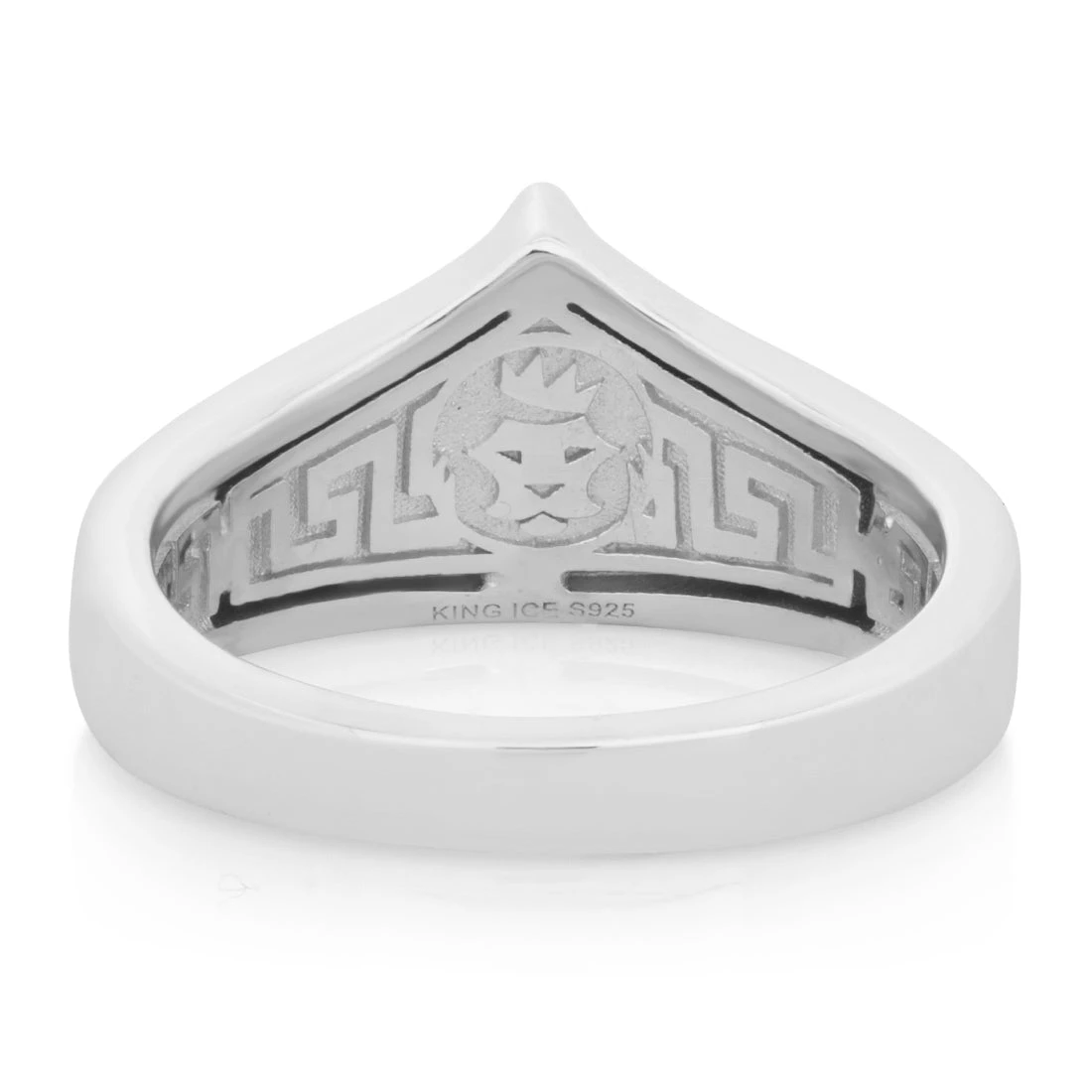 This minimalistic design features a large, trillion-cut stone nested in a full border of stones. The band is polished to perfection and features an inner greek-key pattern.