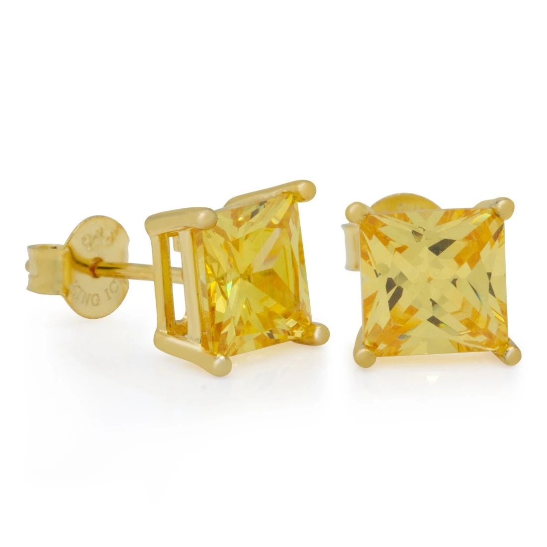 This pair features .925 sterling silver casting studs with 14K gold plating. 4 prong set with canary yellow princess cut CZ and secure with butterfly backing.Â